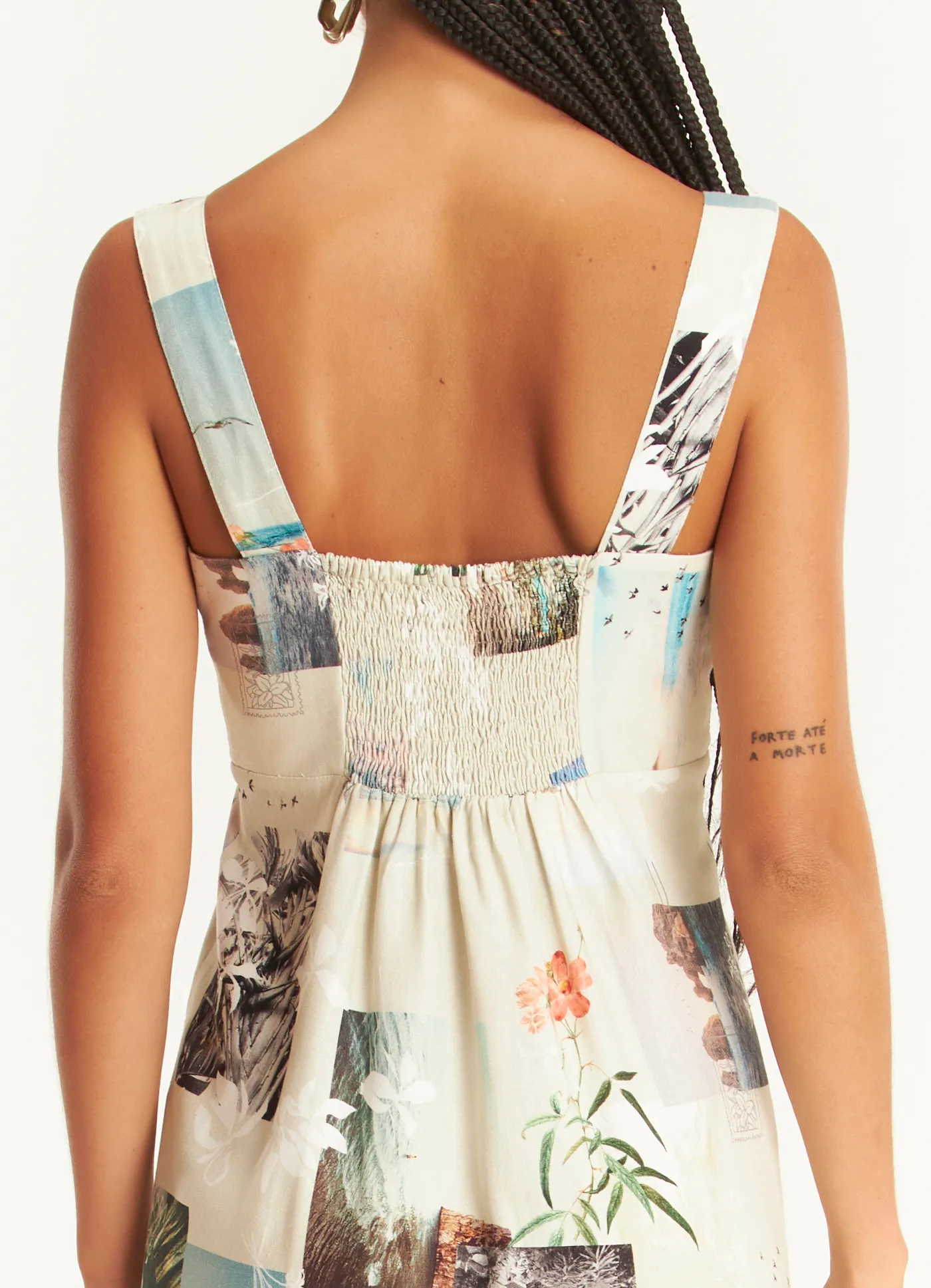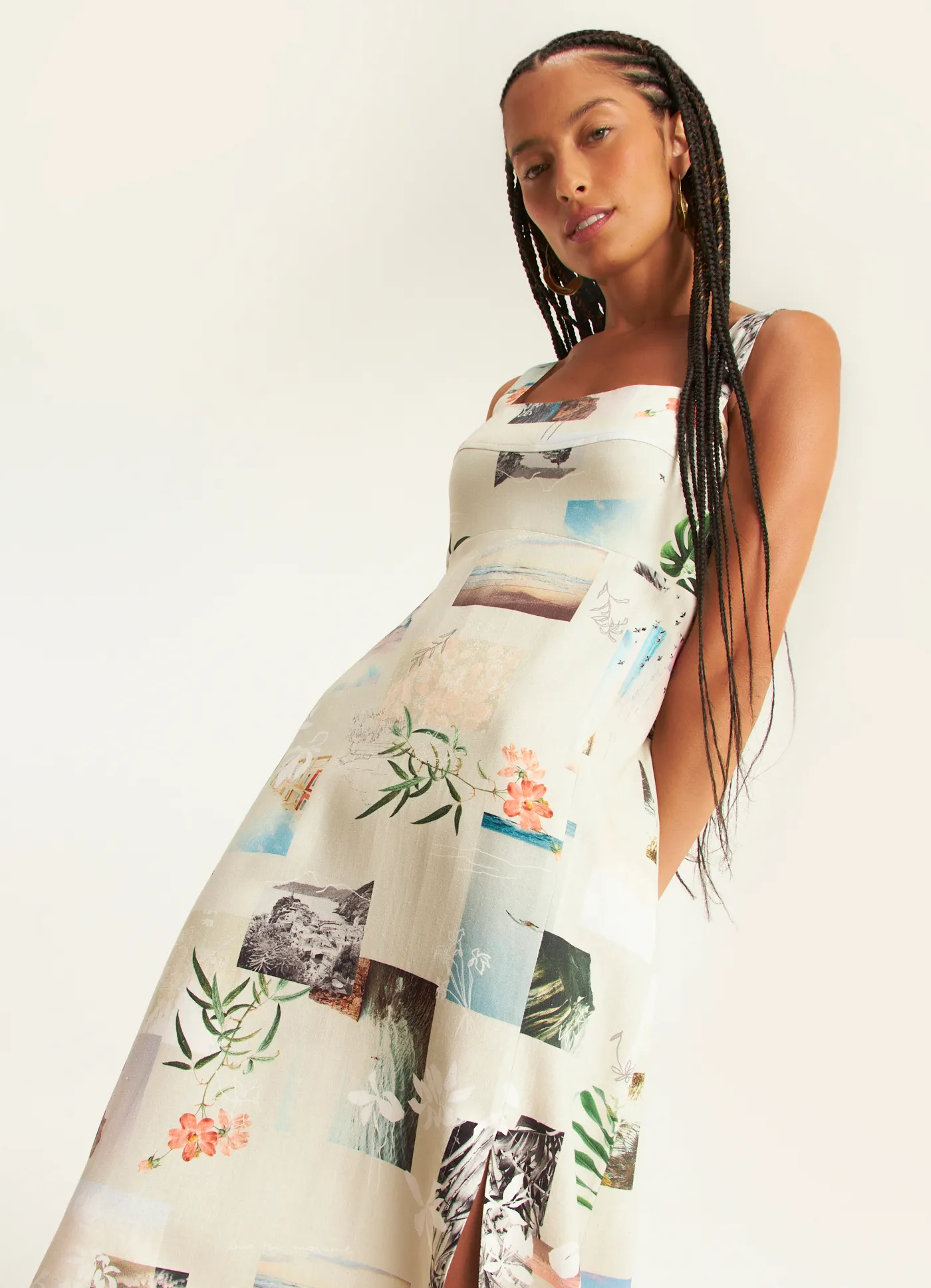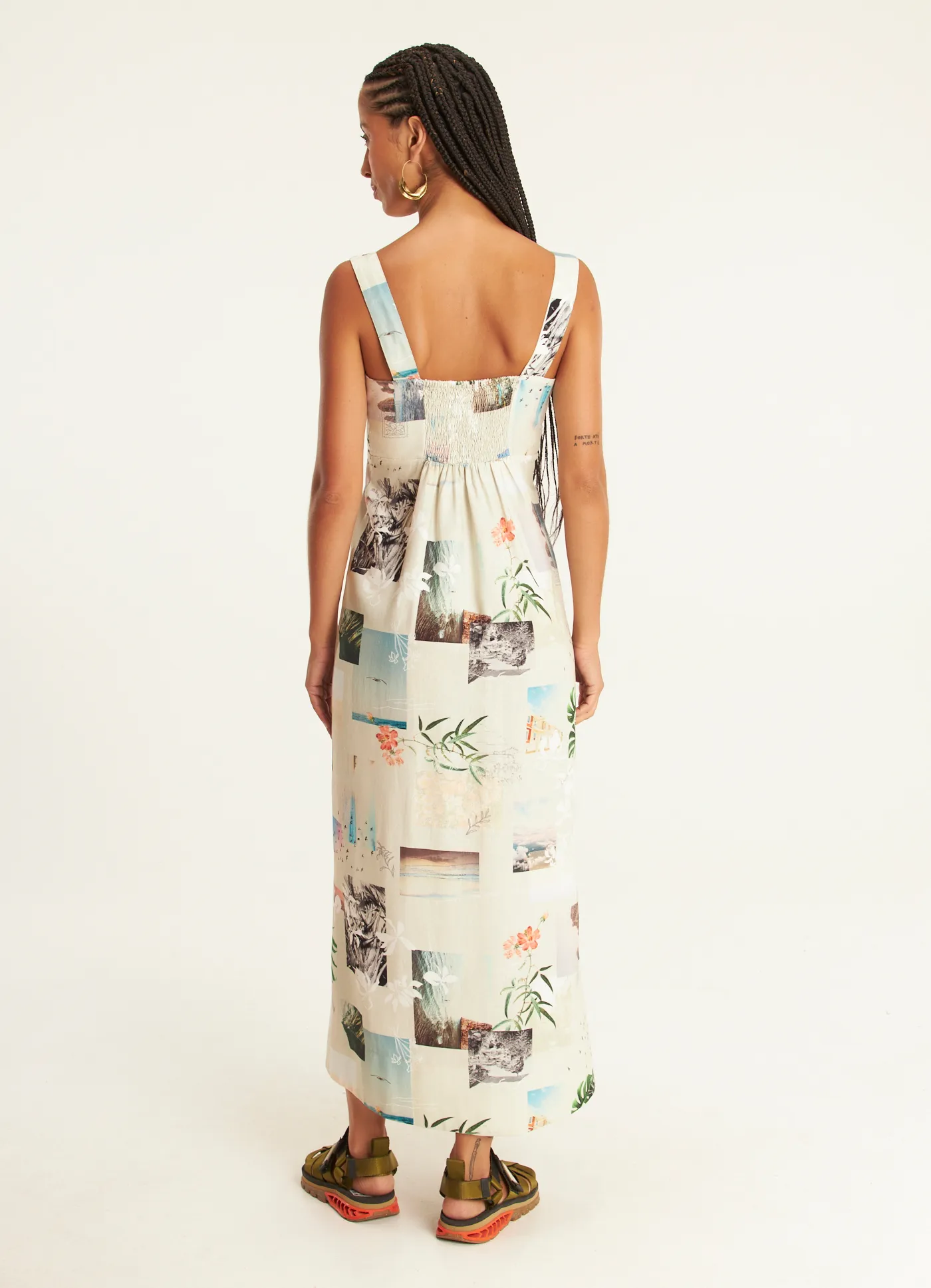 Vestido midi em linho com estampa Álbum possui recorte quadrado no busto com alças largas. A fenda frontal traz fluidez a peça, enquanto o lastéx nas costas promove mais conforto.